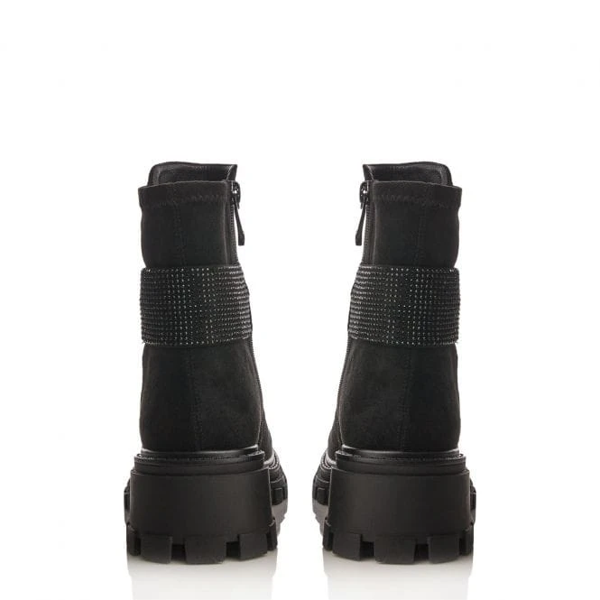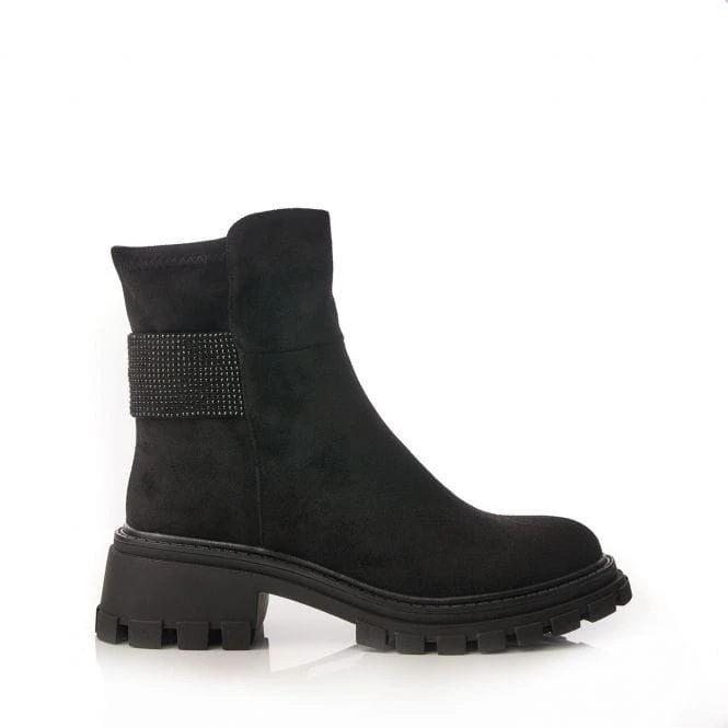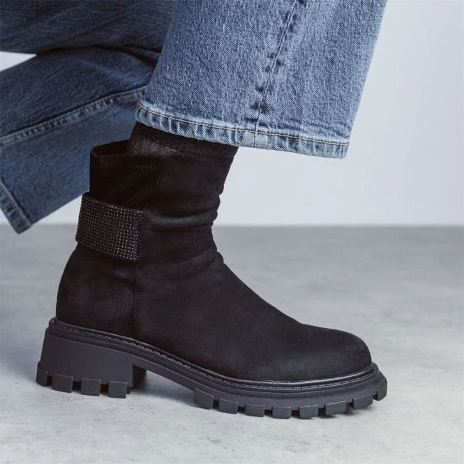 Add a new look to your outfits with Arilen. Complete with a heavy cleated sole and soft round toe, the glitz strap adds a suble touch of glamour whilst leaving the boot effortless to style. The stretch back feature allows for a flawless fit on the ankle for a wear that feels as good as it looks. Complete with padded sock and inside zip. If you wear a half size, we recommend sizing down.