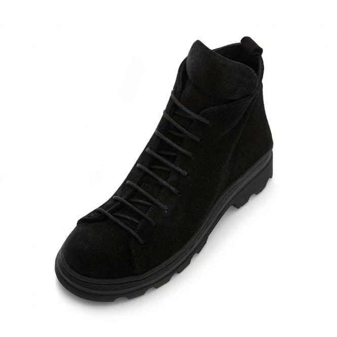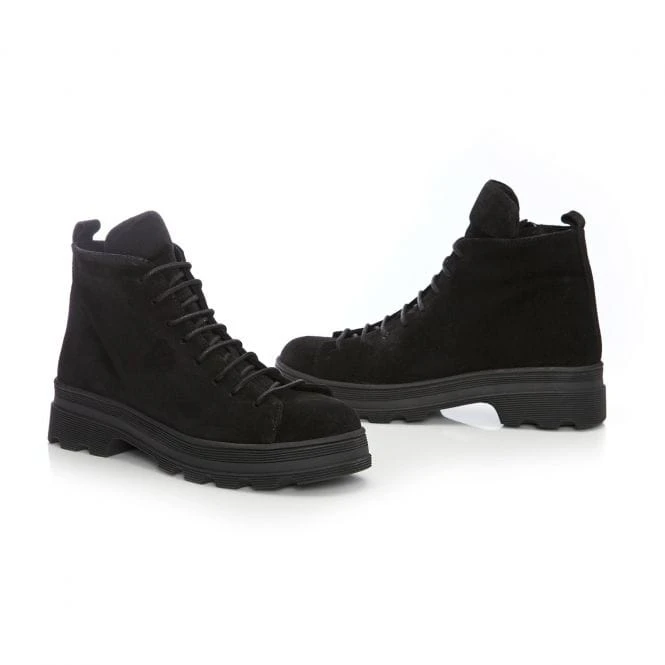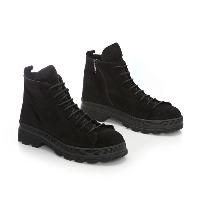 Jude is an all over black suede ankle boot with lace fastening down the front of the boot and a working zip on the inside. Jude is made with suede lining and has a cleated on-trend sole.